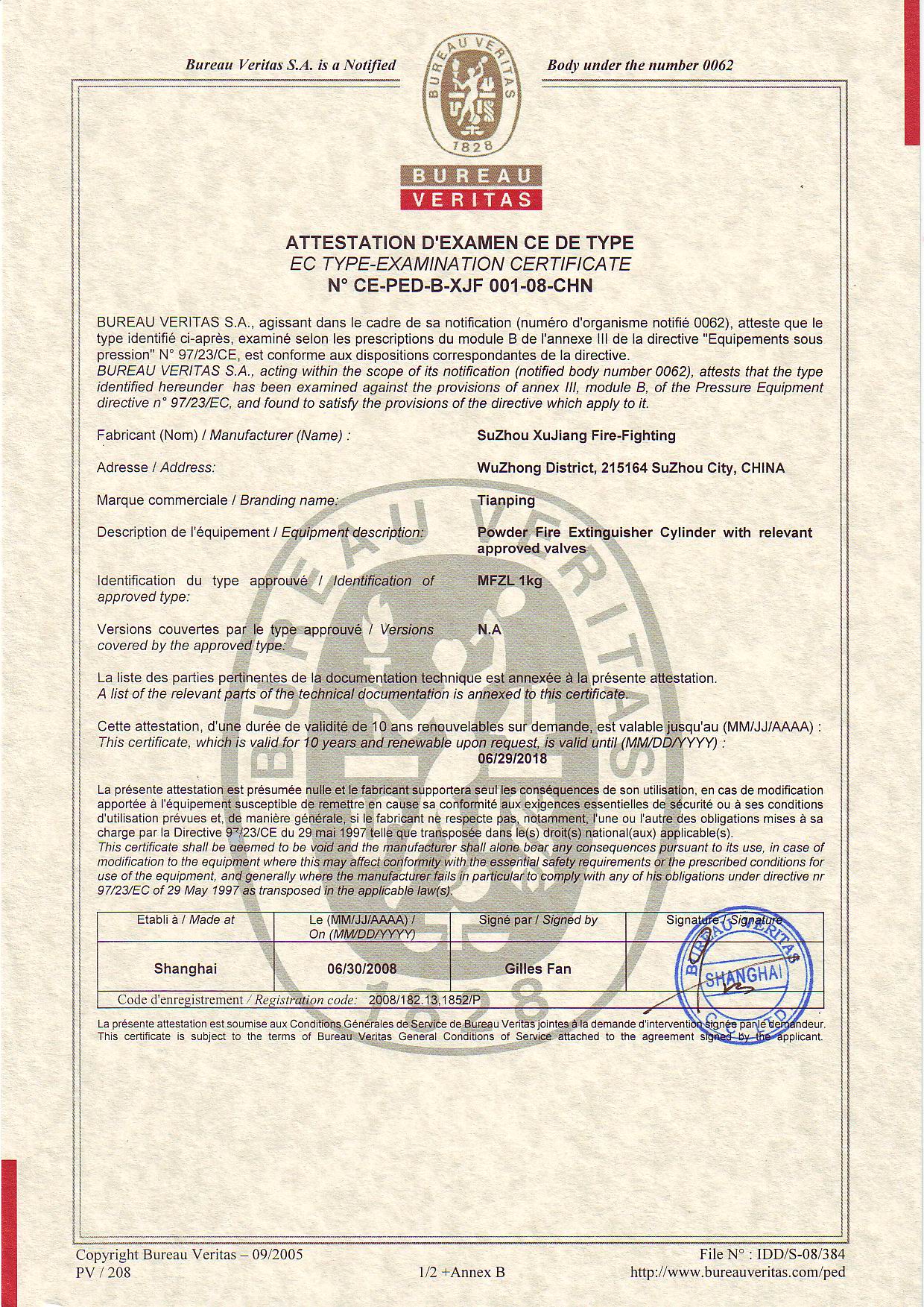In 2004, we got the CE certificate of portable extinguisher, which is approved by Franch Internation Bureau Veritas.